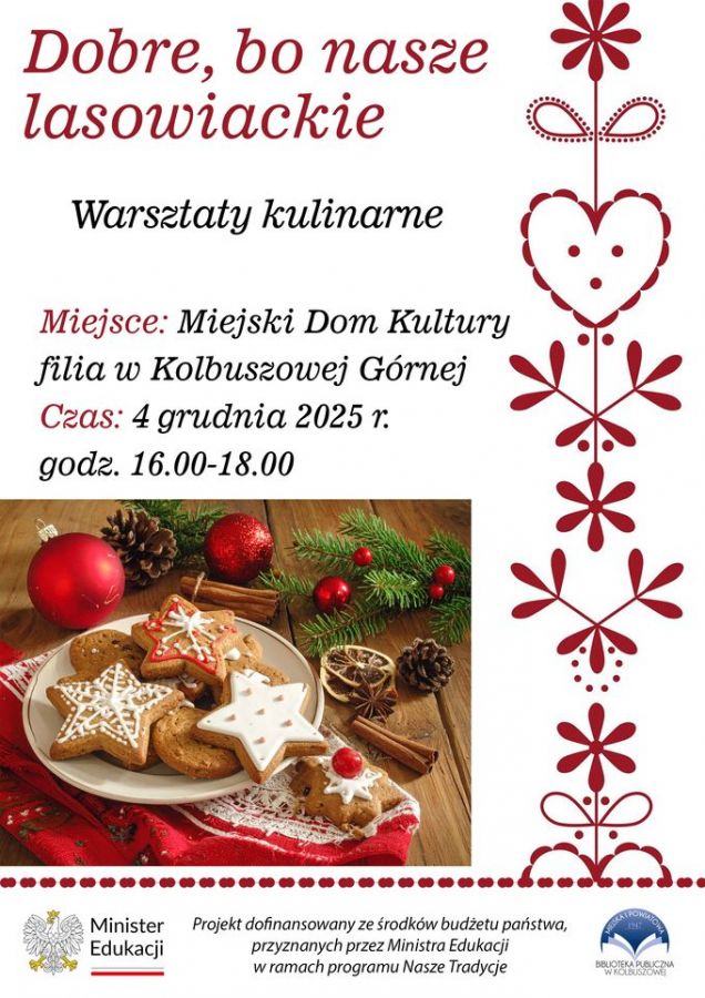 Przypominamy o ostatnich warsztatach z projektu Dobre, bo nasze lasowiackie, które odbędą się w czwartek 4 grudnia 2025 r. od godz. 16.00 do 18.00 w filli Miejskiego Domu Kultury w Kolbuszowej Górnej.
