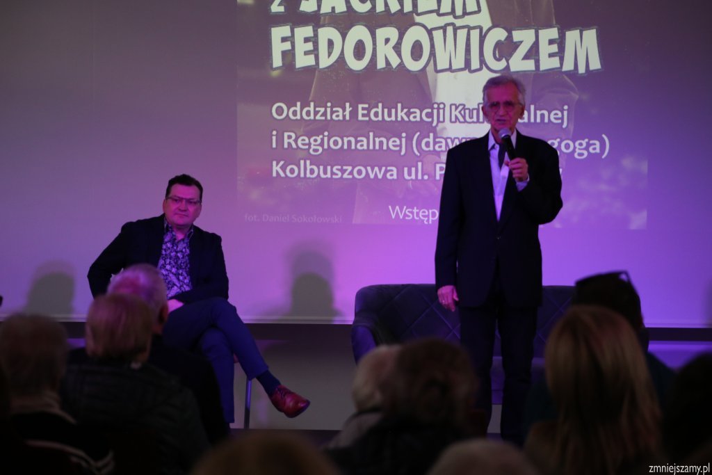 W ramach tegorocznych obchodów Tygodnia Bibliotek 12 maja gościliśmy w Oddziale Edukacji Kulturalnej i Regionalnej kolbuszowskiej biblioteki Jacka Fedorowicza. Licznie zebrana widownia z ogromną przyjemnością słuchała rozmowy naszego gościa z dziennikarzem Marcinem Michrowskim. Było dużo wspomnień, opowieści zwanych przez pana Jacka Fedorowicza „dygresją” oraz dużo dobrego i wyjątkowego humoru.
