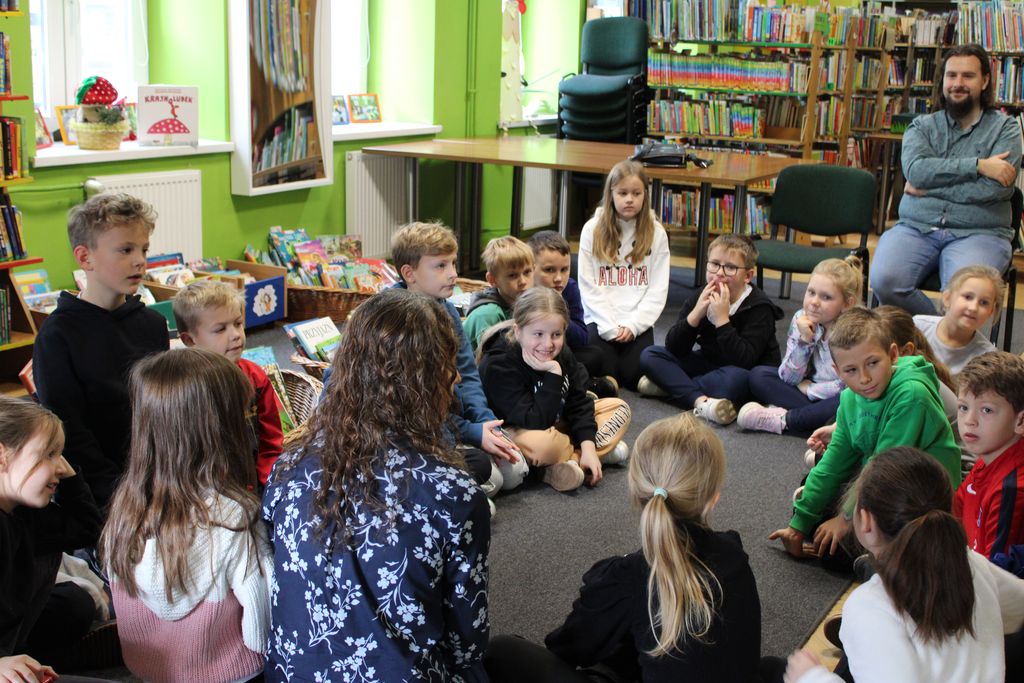 W dniu 21 października 2025 roku Oddział dla Dzieci i Młodzieży gościł uczniów klasy II B Szkoły Podstawowej im. Henryka Sienkiewicza w Kolbuszowej wraz z nauczycielami: Panią Anną Matejek i Panem Jakubem Wasiakiem. Spotkanie poświęcone zostało wzruszającej lekturze pt. Dziewczynka z parku. Dzieci bezbłędnie odpowiadały na pytania związane z lekturą oraz narysowały piękne ilustracje inspirowane historią Andzi i Jeremiasza. W drugiej części spotkana dzieci zwiedziły całą bibliotekę oraz poznały pracę introligatora, gdzie mogły zobaczyć, jak naprawia się książki. Cieszymy się, że większość miłych gości to nasi czytelnicy, a jeszcze bardziej, że po spotkaniu wielu z nich wypożyczyło książki do domu. Serdecznie dziękujemy za pełne wrażeń spotkanie i zapraszamy częściej.