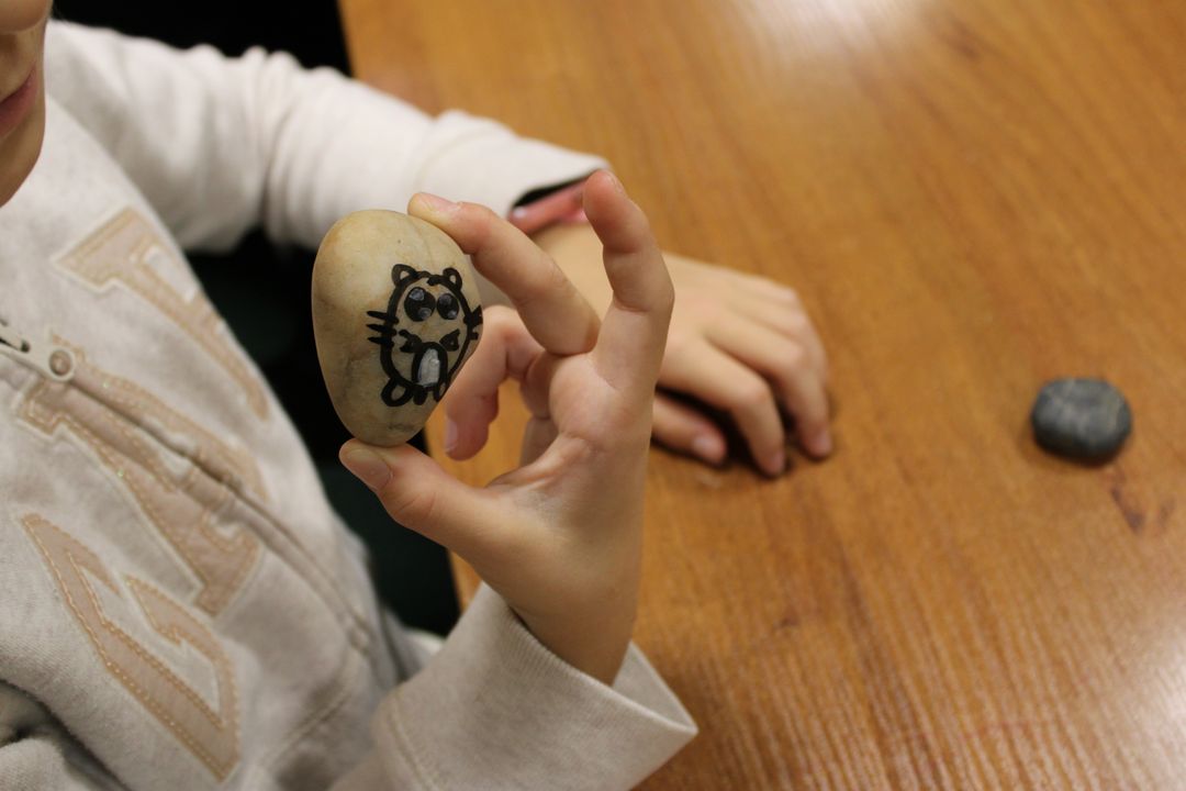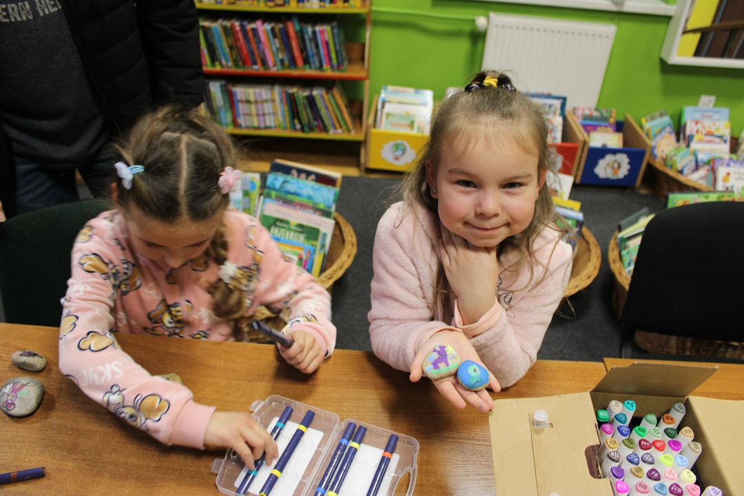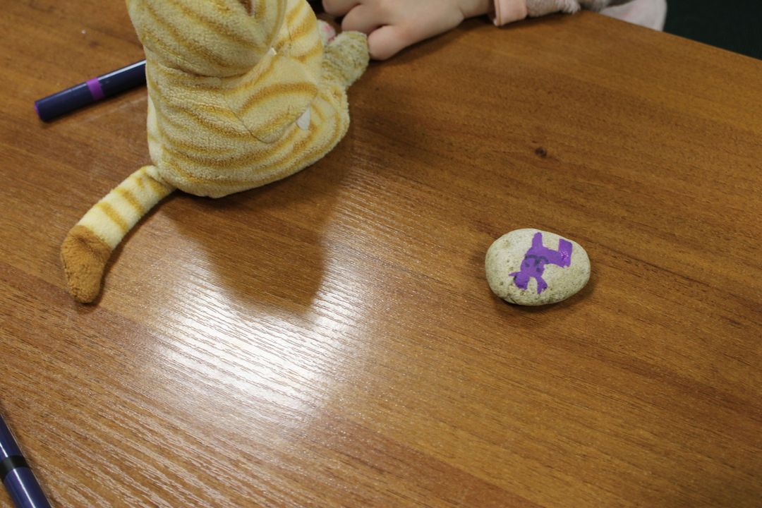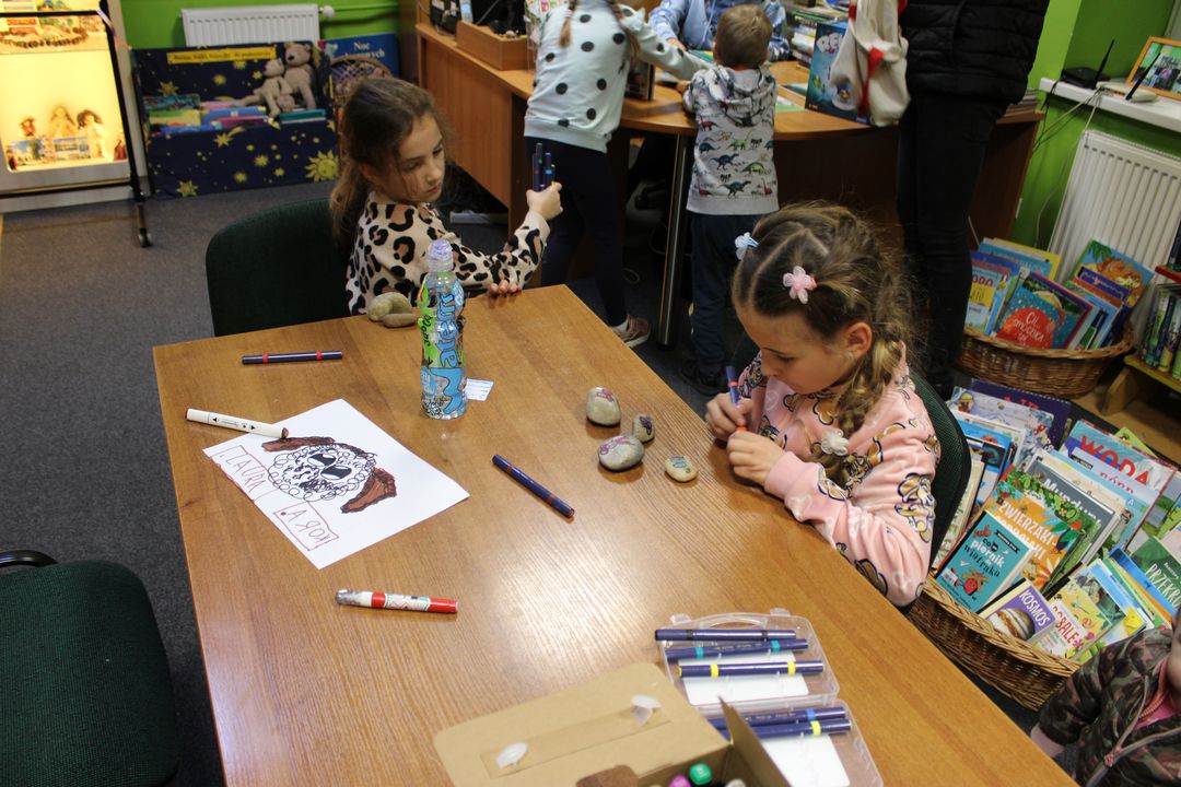 Mali artyści pracowali z zabawką interaktywną ,dzięki której rozpoznawali odgłosy zwierzątek mieszkających w zagrodzie wiejskiej. Rozwiązywali zagadki oraz odpowiadali na pytania związane z trybem życia mieszkańców podwórka. Zajęcia zakończyły się malowaniem i ozdabianiem kamyczków.
