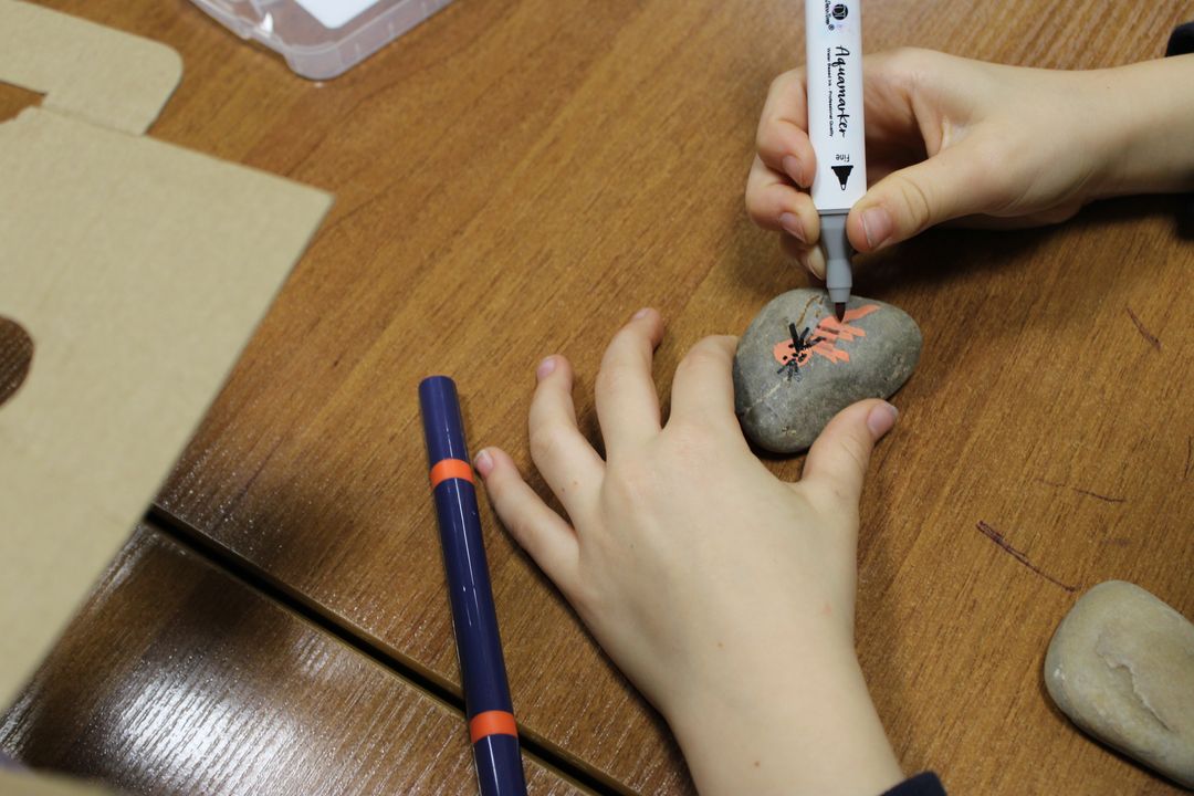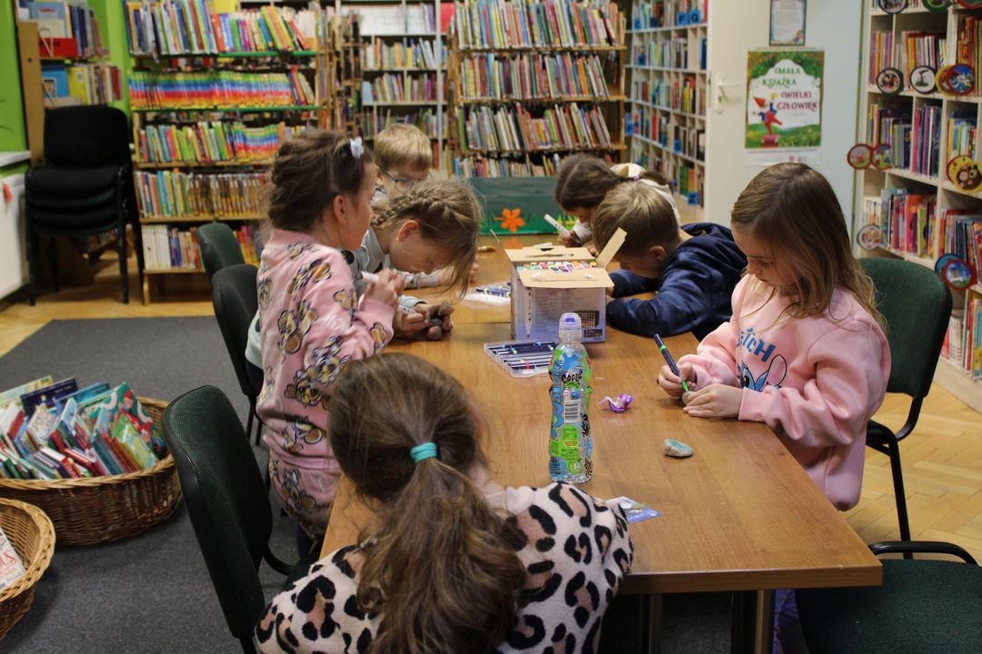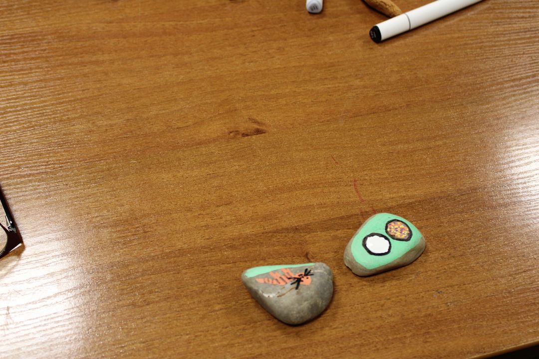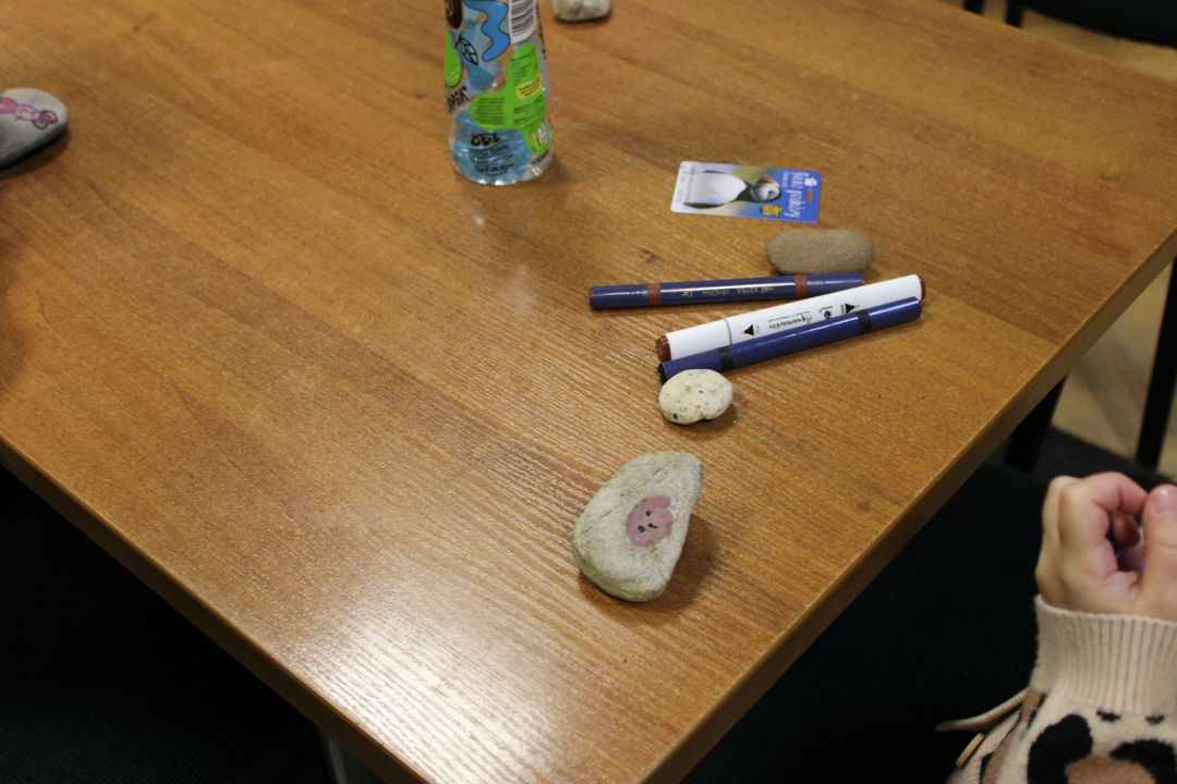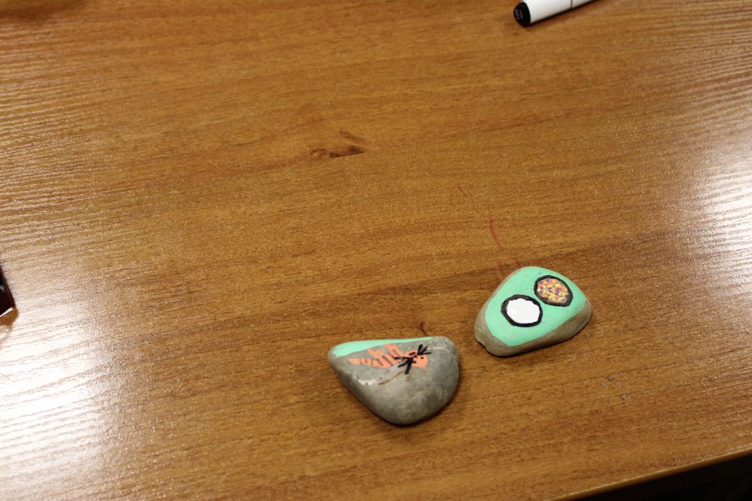 Mali artyści pracowali z zabawką interaktywną ,dzięki której rozpoznawali odgłosy zwierzątek mieszkających w zagrodzie wiejskiej. Rozwiązywali zagadki oraz odpowiadali na pytania związane z trybem życia mieszkańców podwórka. Zajęcia zakończyły się malowaniem i ozdabianiem kamyczków.