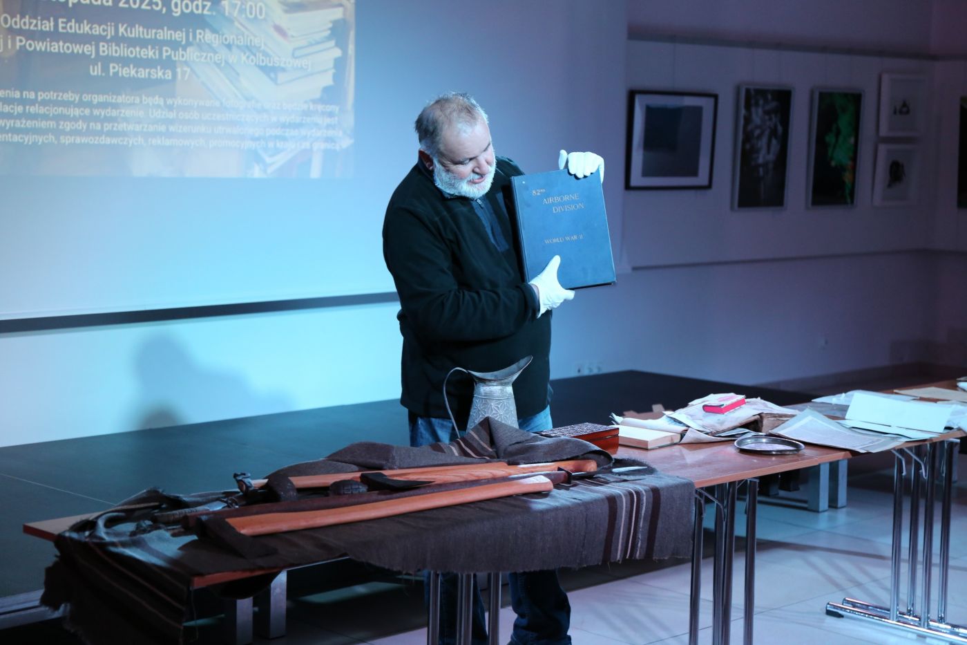 Pan Andrzej Wesołowski zaprezentował kilkanaście najcenniejszych eksponatów, tych najstarszych z XVII w. i tych z czasów, które mieszkańcy Kolbuszowej jeszcze pamiętają. Każda z tych pamiątek ma swoją historię, poznawaliśmy ją podczas spotkania z wielkim zainteresowaniem. Nie mogło zabraknąć podziękowań ze strony naszej biblioteki za wieloletnią, bardzo owocną współpracę z Panem Andrzejem Wesołowskim. Wielokrotnie dzięki uprzejmości mogliśmy korzystać z jego zbiorów tworząc wystawy tematyczne, wydając cenne publikacje, przygotowując spotkania dotyczące historii naszego regionu.