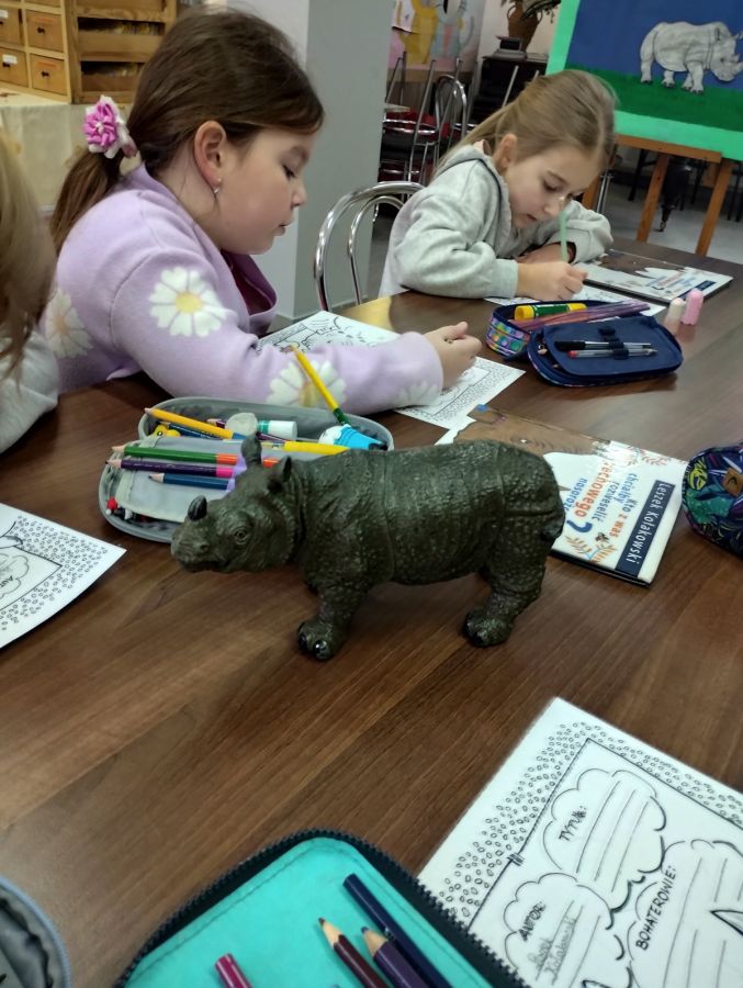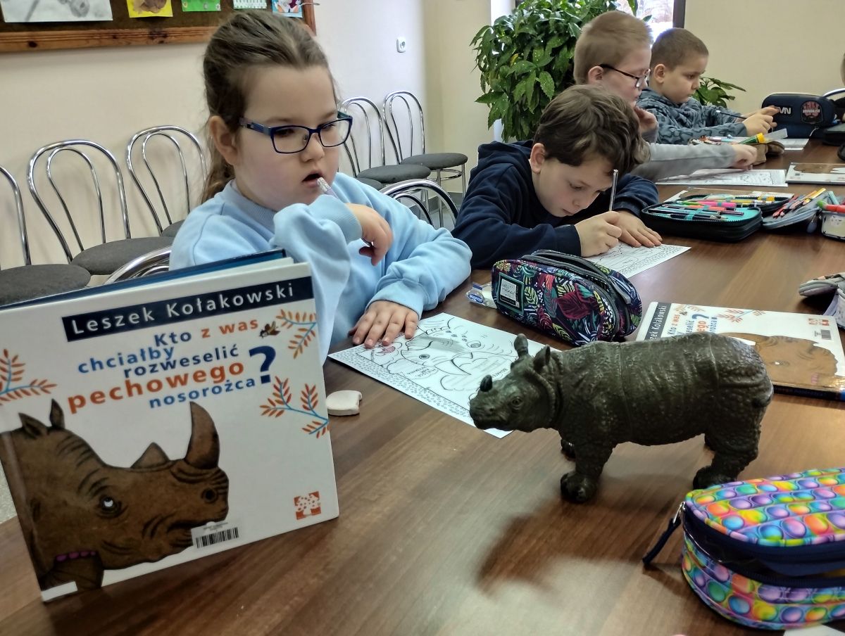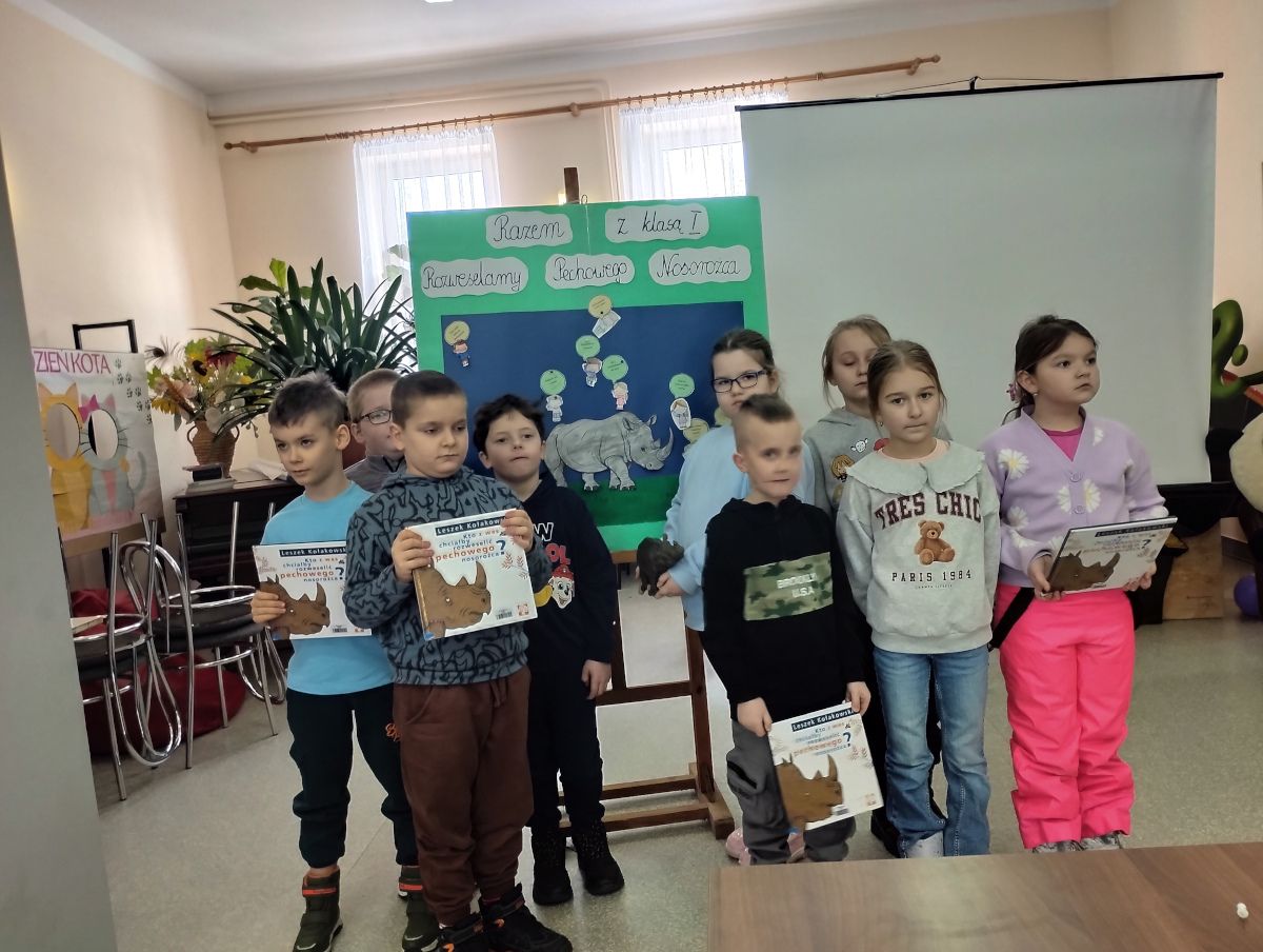 Dziś pomimo mroźnej pogody uczniowie klasy I razem z panią wychowawczynią odwiedzili filię biblioteki w Przedborzu gdzie uczestniczyli w lekcji bibliotecznej poświęconej lekturze „ Kto z was chciałby rozweselić pechowego nosorożca”? Dzieci miały do wykonania sporo zadań : uzupełniały metryczkę książki, wypisywały na wyciętych z papieru kolorowych rączkach własne zdolności i mocne strony, za pomocą dobrych rad pocieszały nosorożca aby nie był smutny a na zakończenie obejrzeliśmy prezentację o nosorożcach z której dowiedzieliśmy się wiele ciekawostek o tych zwierzętach. To była bardzo ciekawe i interesujące spotkanie w bibliotece.