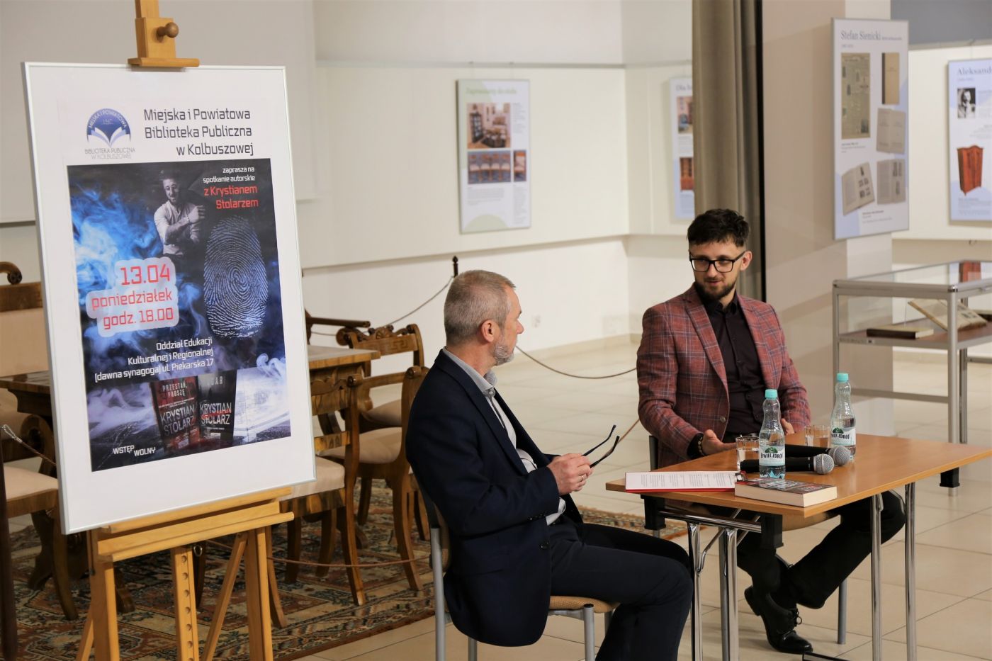 Autor w rozmowie z dyrektorem biblioteki Pawłem Michno opowiedział zebranym czytelnikom o tajnikach swojej pracy pisarskiej, ale też policyjnej. Jego pracy często towarzyszą emocje, które swoje ujście znajdują właśnie w książkach. Oddaje się pisarstwu bezgranicznie, a z nami podzielił się kolejnymi pomysłami na kolejne powieści. W drugiej części spotkania Krystian Stolarz odpowiedział na wnikliwe często pytania czytelników. Nie brakowało pytań o pracę w policji, ale też co do pracy pisarskiej, a nawet osobistych, rodzinnych wątków. Pisarz opowiedział także o swoich kontaktach z innymi autorami powieści kryminalnych, którzy pojawili się na kartach jego powieści.
