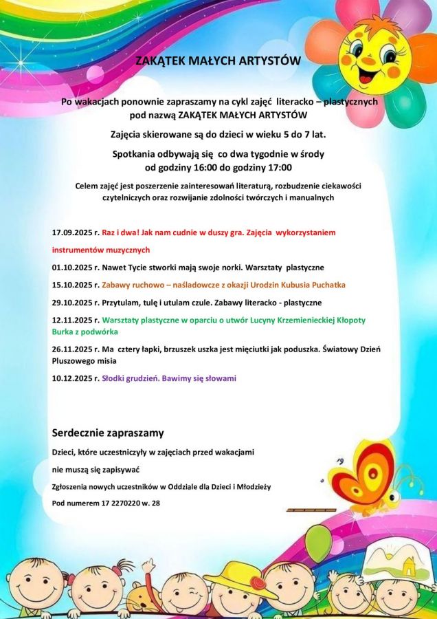 Po wakacjach ponownie zapraszamy na cykl zajęć literacko – plastycznych pod nazwą ZAKĄTEK MAŁYCH ARTYSTÓW