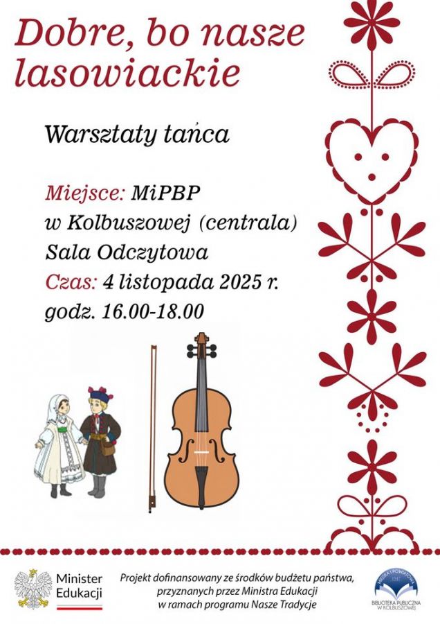 Przypominamy o kolejnych warsztatach tańca, które odbędą się 4 listopada 2025 r. od godz. 16.00 do 18.00 w Sali Odczytowej Miejskiej i Powiatowej Biblioteki Publicznej w Kolbuszowej (centrala) przy ul. Piłsudskiego 7.