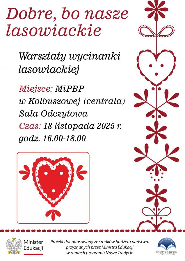 Przypominamy o kolejnych warsztatach z projektu Dobre, bo nasze lasowiackie, które odbędą się 18 listopada 2025 r. (wtorek) od godz. 16.00 do 18.00 w Sali Odczytowej Miejskiej i Powiatowej Biblioteki Publicznej w Kolbuszowej (centrala) przy ul. Piłsudskiego 7.