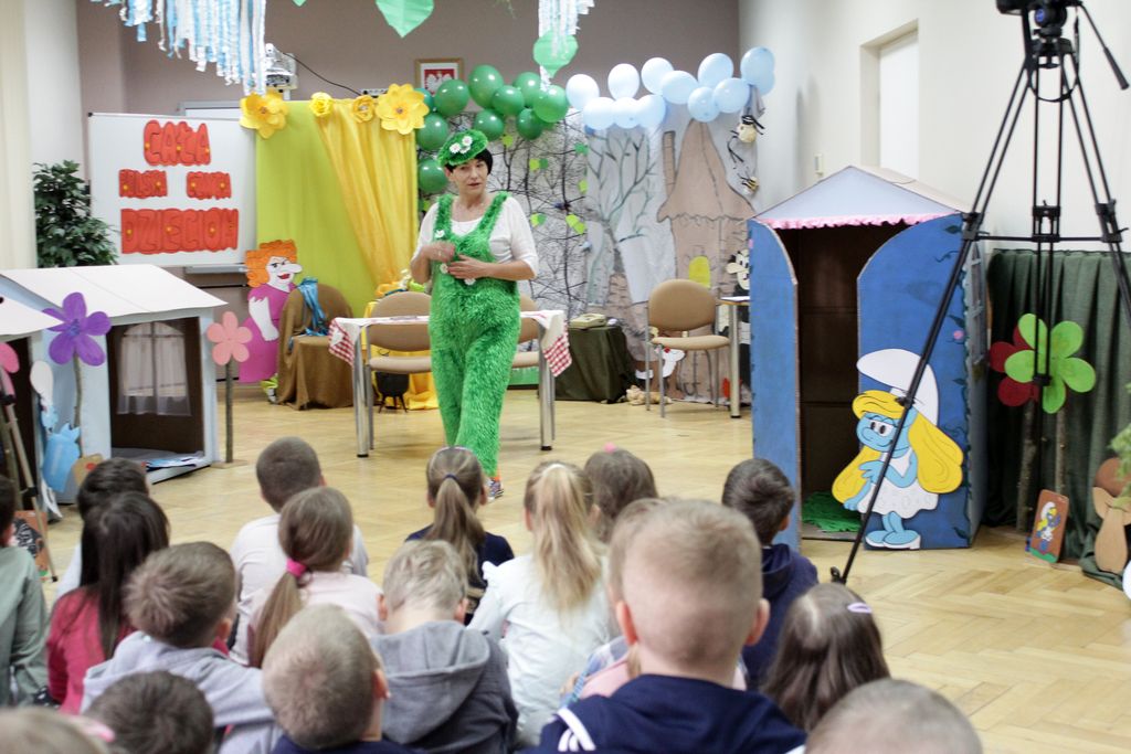 Z przedstawicieli władz powiatowych czytały: Pani Dominika Gaweł, Pani Sylwia Sucharzewska i Pani Anna Stec. W drugiej części spotkania dzieci obejrzały spektakl przedstawiający dzień pełen wrażeń z życia Smerfów w wykonaniu pracowników biblioteki.