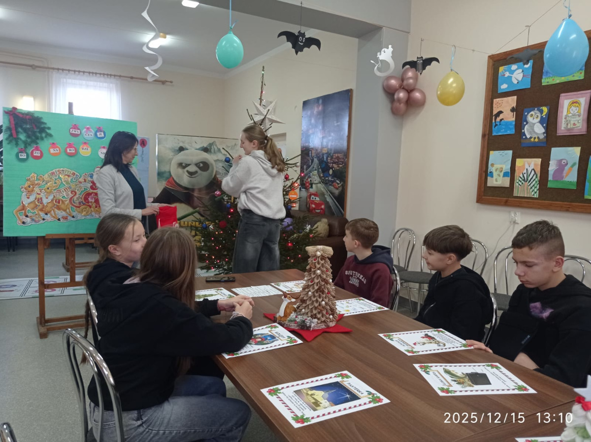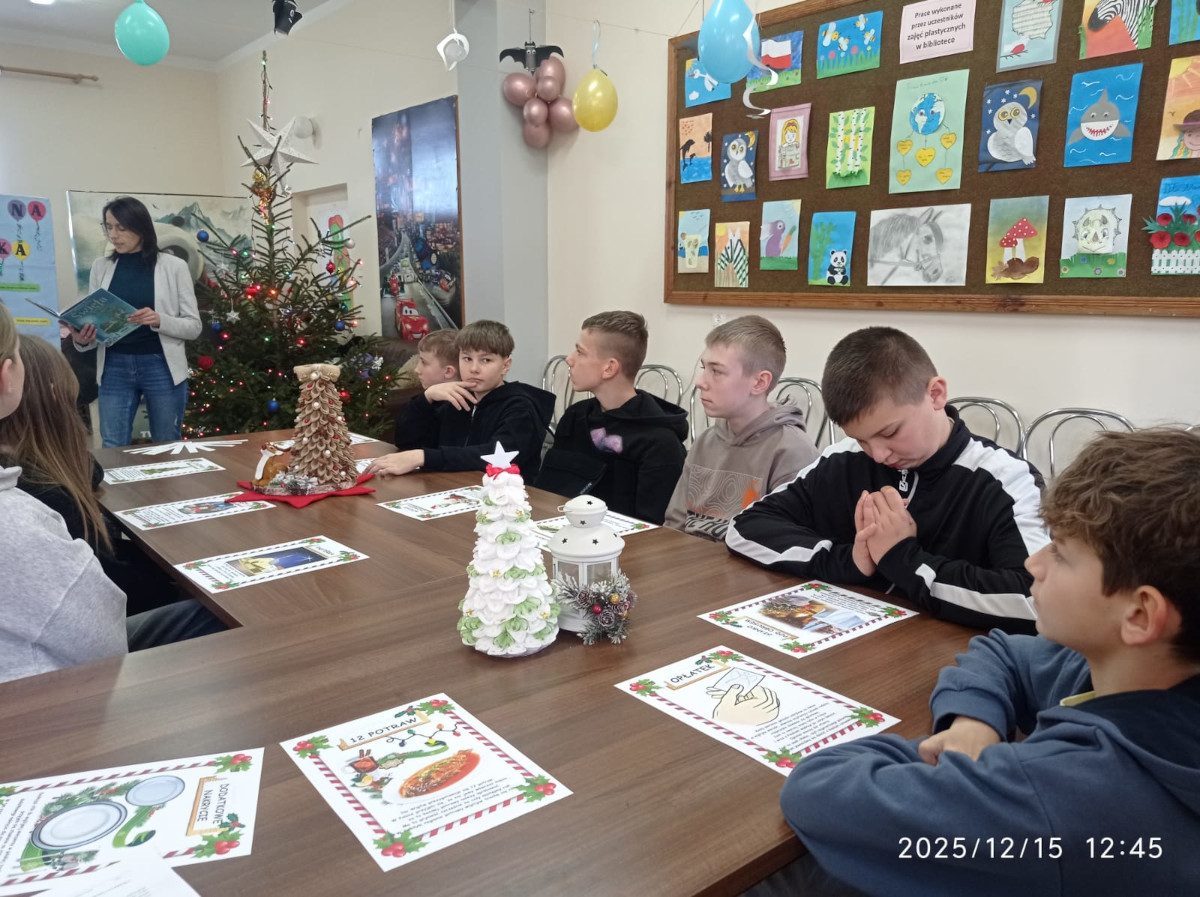 Boże Narodzenie to jedno z najradośniejszych i najbardziej wyczekiwanych świąt w roku. W oczekiwaniu na ten magiczny czas w filii biblioteki w Przedborzu odbyła się lekcja biblioteczna  podczas której uczniowie klasy VI  starali się odpowiedzieć na pytania : Co to jest Adwent? Co jest wyjątkowego w polskiej Wigilii Bożego Narodzenia? Dlaczego Pasterka zaczyna się o północy? Skąd zwyczaj strojenia choinek w naszych domach? Jakie potrawy przygotowujemy na wigilijny wieczór? I jeszcze wiele, wiele innych. Uczniowie aktywnie uczestniczyli w rozmowie, wykazali się dużą znajomością tematu, chętnie brali udział w zabawach i quizach dotyczących zwyczajów bożonarodzeniowych. Na zakończenie naszego spotkania uczestnicy rozegrali grę planszową z zadaniami przy okazji utrwalając wiadomości zdobyte podczas lekcji bibliotecznej. Spotkanie upłynęło w bardzo miłej i radosnej atmosferze, wprowadzając nas w nastrój zbliżających się świąt. Dziękuję Wszystkim za te piękne chwile i życzę radosnego przeżywania Świąt Bożego Narodzenia oraz wszelkiej pomyślności w Nowym Roku.