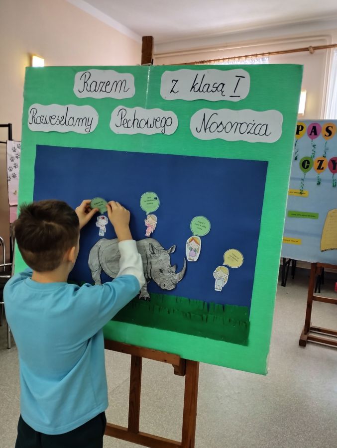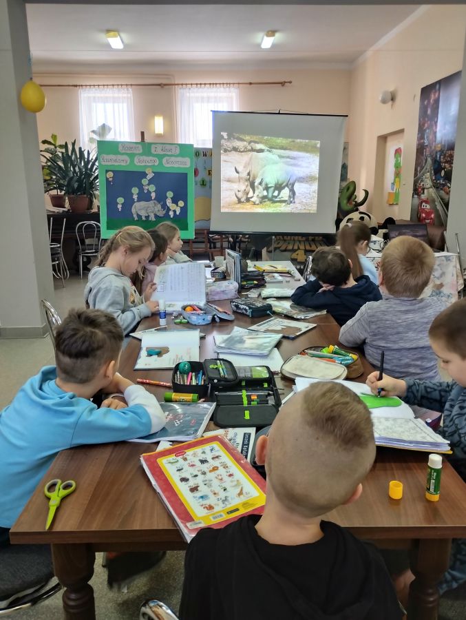 Dziś pomimo mroźnej pogody uczniowie klasy I razem z panią wychowawczynią odwiedzili filię biblioteki w Przedborzu gdzie uczestniczyli w lekcji bibliotecznej poświęconej lekturze „ Kto z was chciałby rozweselić pechowego nosorożca”? Dzieci miały do wykonania sporo zadań : uzupełniały metryczkę książki, wypisywały na wyciętych z papieru kolorowych rączkach własne zdolności i mocne strony, za pomocą dobrych rad pocieszały nosorożca aby nie był smutny a na zakończenie obejrzeliśmy prezentację o nosorożcach z której dowiedzieliśmy się wiele ciekawostek o tych zwierzętach. To była bardzo ciekawe i interesujące spotkanie w bibliotece.
