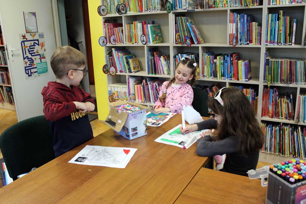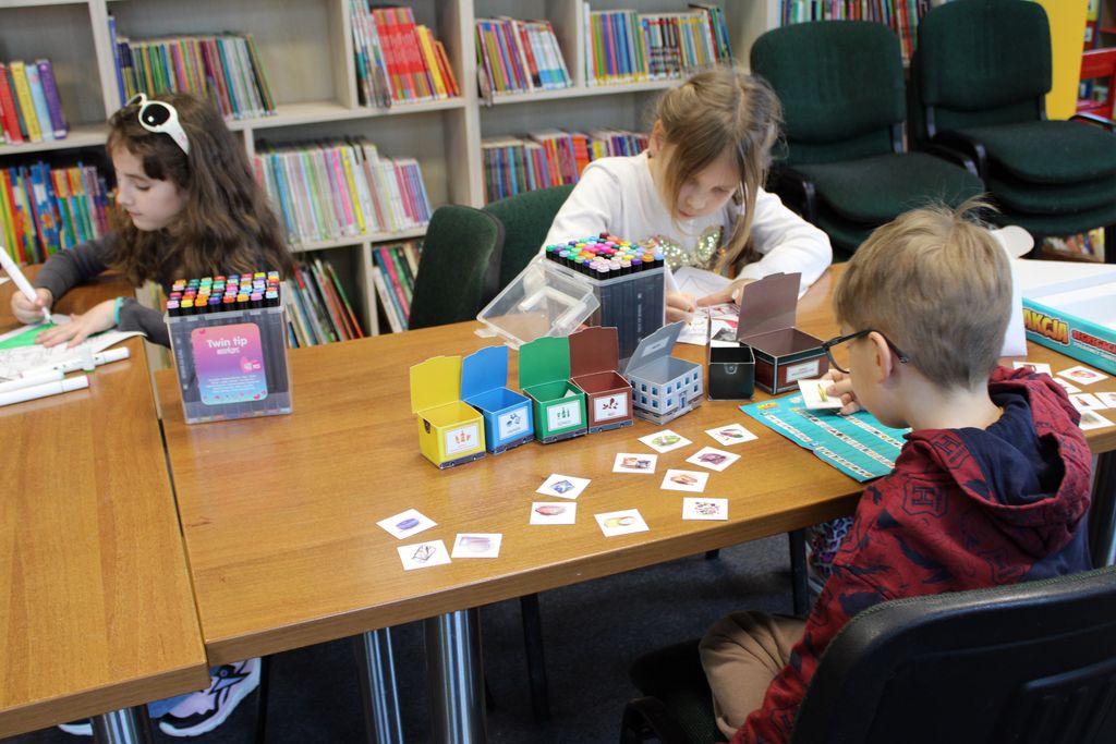 Z okazji Światowego Dnia Recyklingu w dniu 18 marca 2026 roku odbyły się środowe zajęcia plastyczne z cyklu Zakątek Małych Artystów. W ramach spotkania wykorzystano grę planszową Akcja Segregacja, dzięki której dzieci zapoznały się z zasadami prawidłowej segregacji odpadów i recyklingu. W drugiej części warsztatów Mali Artyści wykonali domki z pieskami na wyspie. Serdecznie dziękujemy dzieciom za aktywny udział, pomysłowość oraz zaangażowanie podczas zajęć.